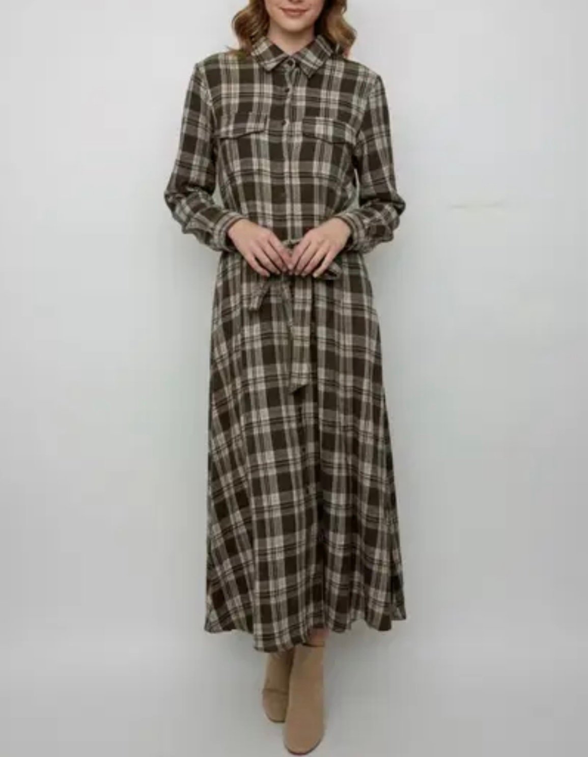 Abito con bottoni e cintura fantasia quadro.
