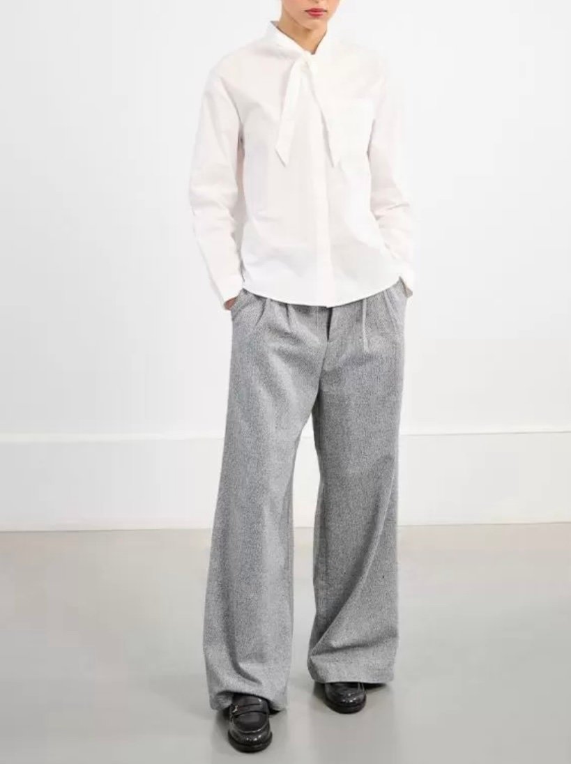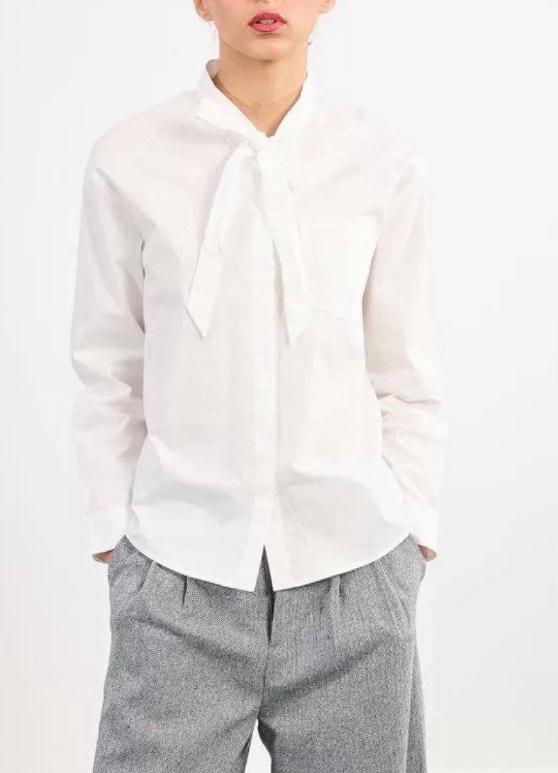 Collo a fascetta che permette l’allacciatura di un fiocco sull’abbottonatura.
