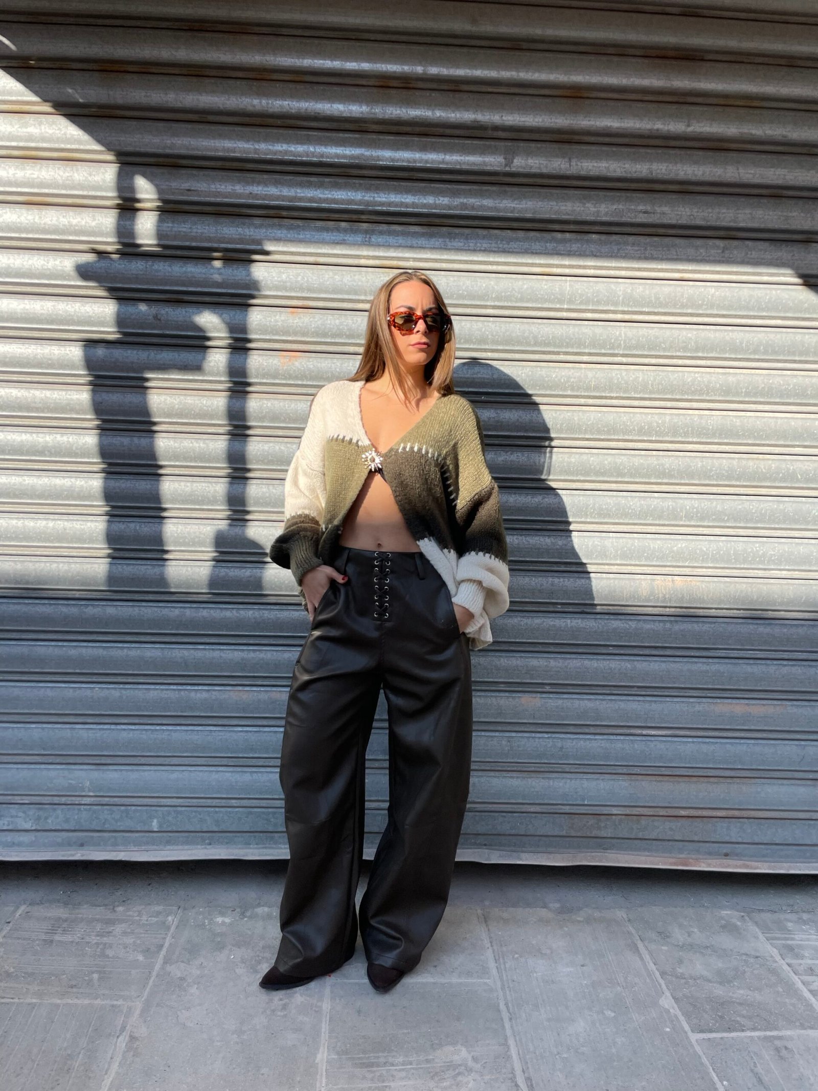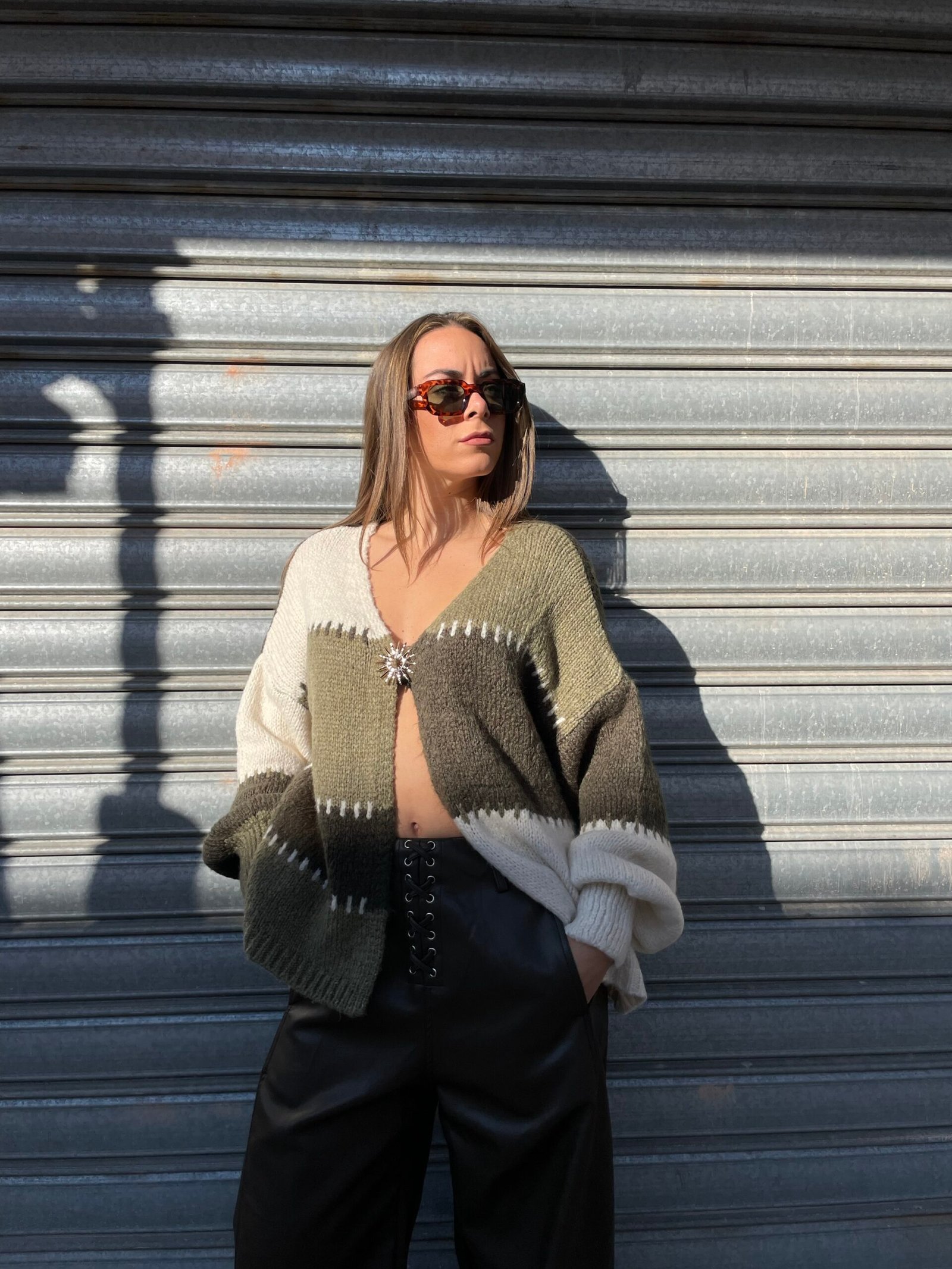 Cardigan in aperto con spilla sole.